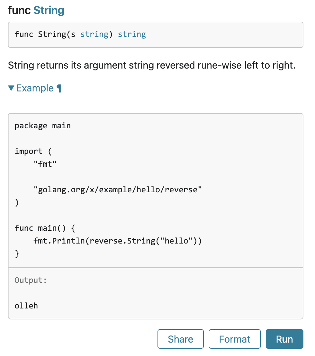 Godoc examples are snippets of Go code that are displayed as package documentation and that are verified by running them as tests. They can also be run by a user visiting the godoc web page for the package and clicking the associated “Run” button.