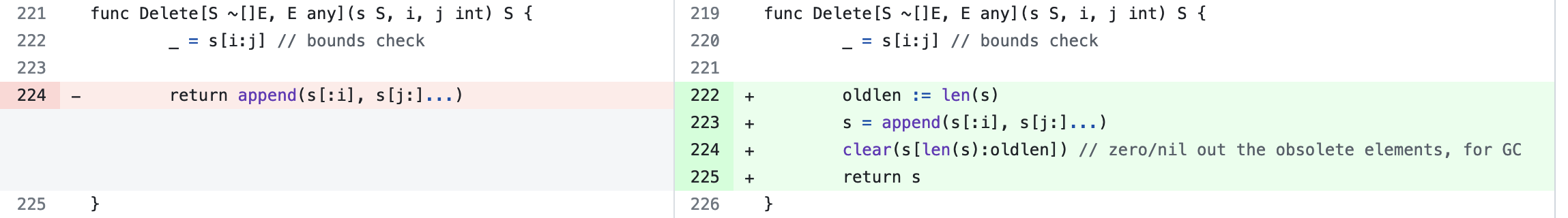 Before Go 1.22, slices.Delete didn’t modify the elements between the new and original lengths of the slice. While the returned slice wouldn’t include these elements, the “gap” created at the end of the original, now-invalidated slice continued to hold onto them. These elements could contain pointers to large objects (a 20MB image), and the garbage collector would not release the memory associated with these objects. This resulted in a memory leak that could lead to significant performance issues.