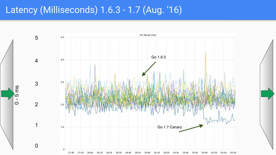 But short term 2014 we had to get our act together. We had to convert all of the runtime and compiler to Go. They were written in C at the time. No more C, no long tail of bugs due to C coders not understanding GC but having a cool idea about how to copy strings. We also needed something quickly and focused on latency but the performance hit had to be less than the speedups provided by the compiler. So we were limited. We had basically a year of compiler performance improvements that we could eat up by making the GC concurrent. But that was it. We couldn’t slow down Go programs. That would have been untenable in 2014.