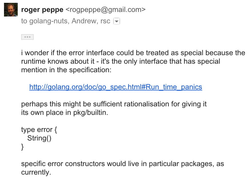 }Before the Go 1 meeting, Russ raised the issue in the design document: