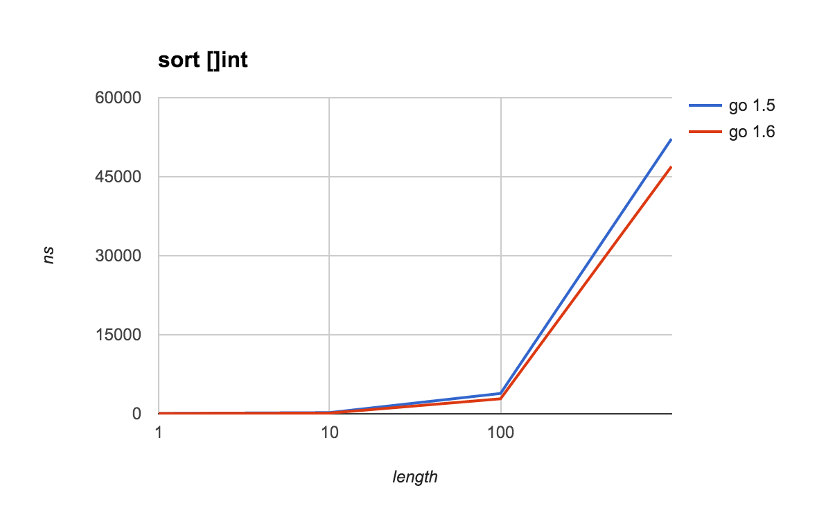 BenchmarkSort_1-4 20000000 64.7 ns/op BenchmarkSort_10-4 10000000 137 ns/op BenchmarkSort_100-4 500000 2849 ns/op BenchmarkSort_1000-4 30000 46949 ns/op